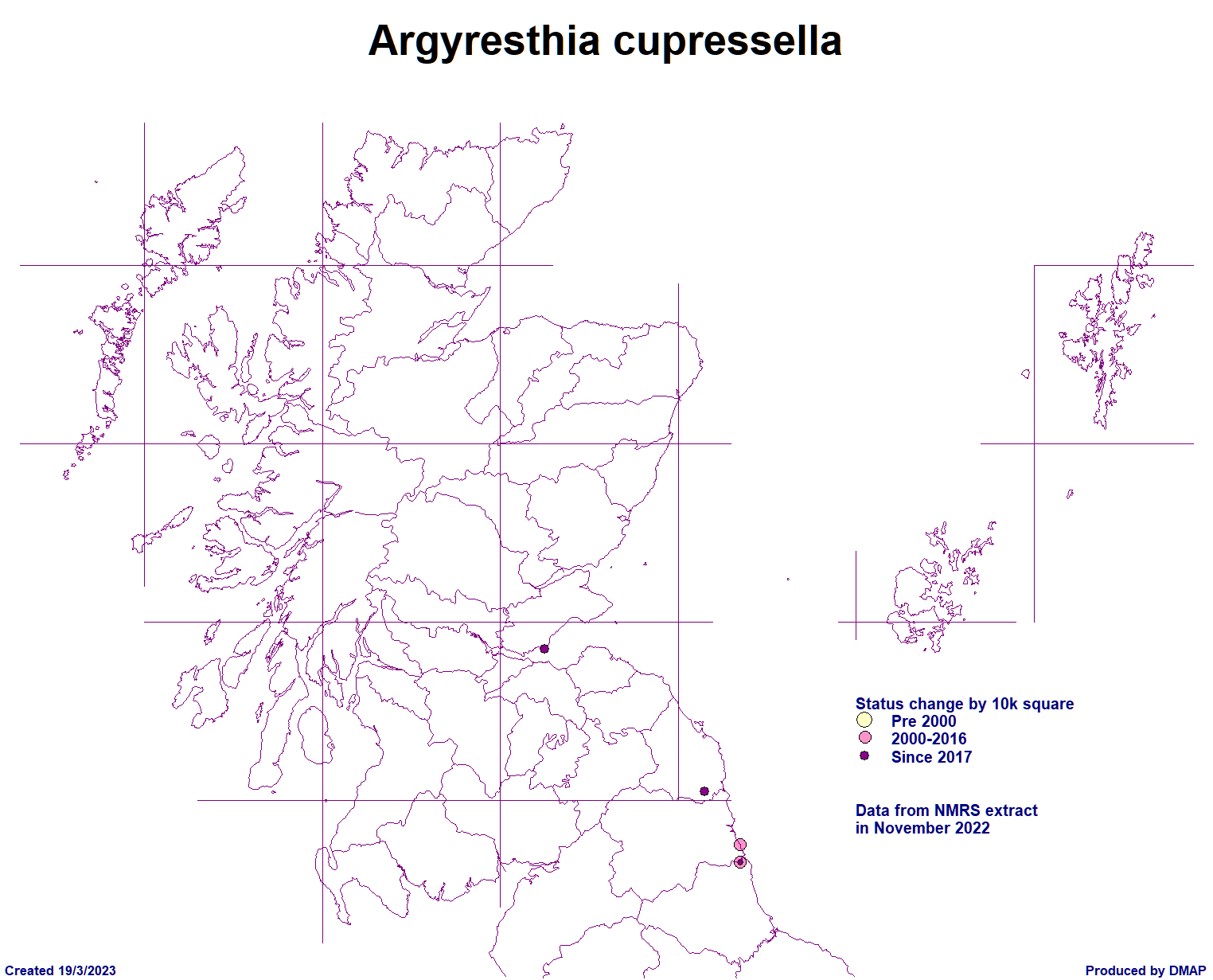 The table on this page lists the micro moths of the family shown that have been recorded in Scotland. The maps show, at a vice county level, where each species has been recorded.