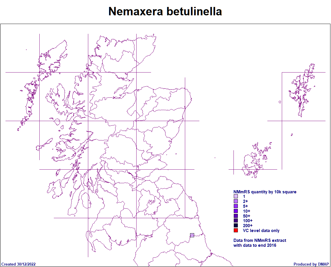 Scottish Micro Moth Distribution Maps Compiled by Mark Cubitt The table on this page lists the micro moths of the family shown that have been recorded in Scotland. The maps show, at a vice county level, where each species has been recorded. Clicking on the map will show an enlarged version of the map. The cursor (arrow) keys on a keyboard can be used to move to the next or previous species' enlarged map. Clicking on the Taxon (scientific name) will open a browser window for that species in the ukmoths web site. Data has been supplied by Dr Mark Young in collaboration with Tony Davis. The list is provisional and may contain some errors and Mark would welcome any comments about this from anyone finding such errors. New vice county records are published in the Annual Microlepidoptera Review, which appears each year in the Entomologists Record journal. Updates are made periodically based on new records which should be submitted annually via your county moth recorder to both Mark and Tony. . Species with a first record in 2016 and later are shown with a blue spot, in 2020 with green and earlier records an orange spot. Page last created: 12/09/2025