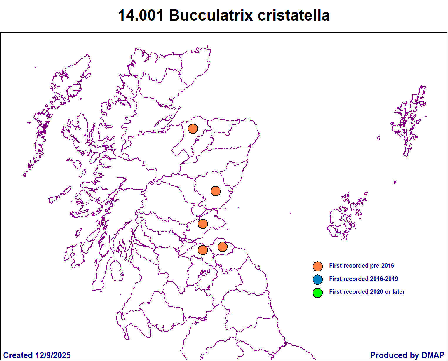 Scottish Micro Moth Distribution Maps Compiled by Mark Cubitt The table on this page lists the micro moths of the family shown that have been recorded in Scotland. The maps show, at a vice county level, where each species has been recorded. Clicking on the map will show an enlarged version of the map. The cursor (arrow) keys on a keyboard can be used to move to the next or previous species' enlarged map. Clicking on the Taxon (scientific name) will open a browser window for that species in the ukmoths web site. Data has been supplied by Dr Mark Young in collaboration with Tony Davis. The list is provisional and may contain some errors and Mark would welcome any comments about this from anyone finding such errors. New vice county records are published in the Annual Microlepidoptera Review, which appears each year in the Entomologists Record journal. Updates are made periodically based on new records which should be submitted annually via your county moth recorder to both Mark and Tony. . Species with a first record in 2016 and later are shown with a blue spot, in 2020 with green and earlier records an orange spot. Page last created: 14/03/2025