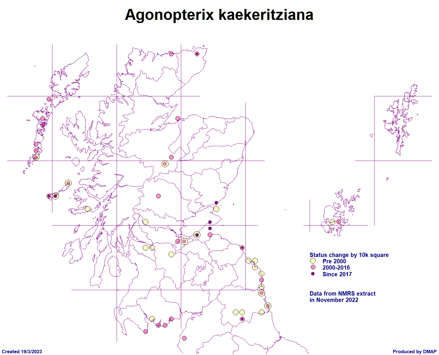 The table on this page lists the micro moths of the family shown that have been recorded in Scotland. The maps show, at a vice county level, where each species has been recorded.