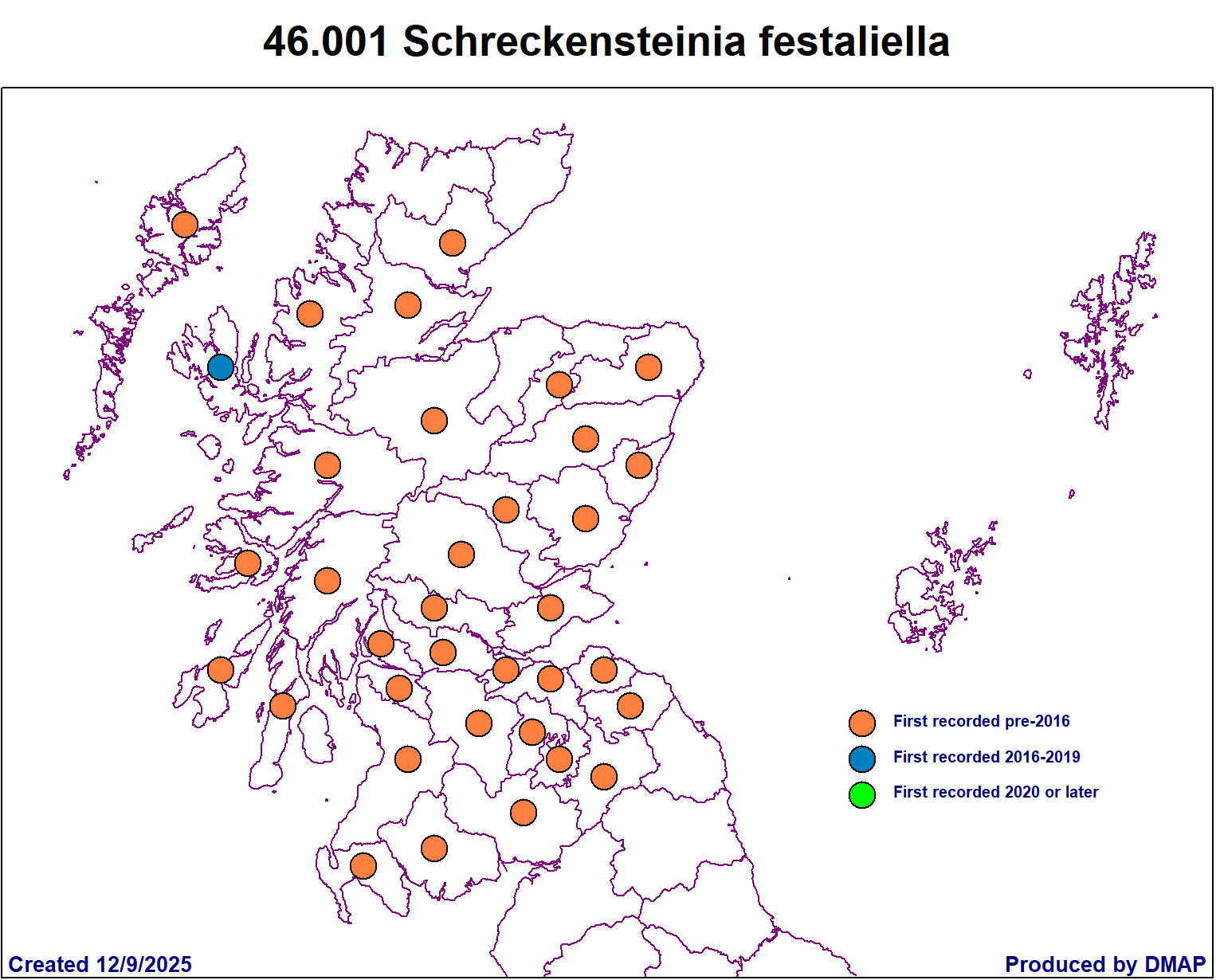 Scottish Micro Moth Distribution Maps Compiled by Mark Cubitt The table on this page lists the micro moths of the family shown that have been recorded in Scotland. The maps show, at a vice county level, where each species has been recorded. Clicking on the map will show an enlarged version of the map. The cursor (arrow) keys on a keyboard can be used to move to the next or previous species' enlarged map. Clicking on the Taxon (scientific name) will open a browser window for that species in the ukmoths web site. Data has been supplied by Dr Mark Young in collaboration with Tony Davis. The list is provisional and may contain some errors and Mark would welcome any comments about this from anyone finding such errors. New vice county records are published in the Annual Microlepidoptera Review, which appears each year in the Entomologists Record journal. Updates are made periodically based on new records which should be submitted annually via your county moth recorder to both Mark and Tony. . Species with a first record in 2016 and later are shown with a blue spot, in 2020 with green and earlier records an orange spot. Page last created: 14/03/2025