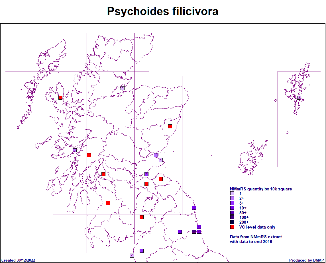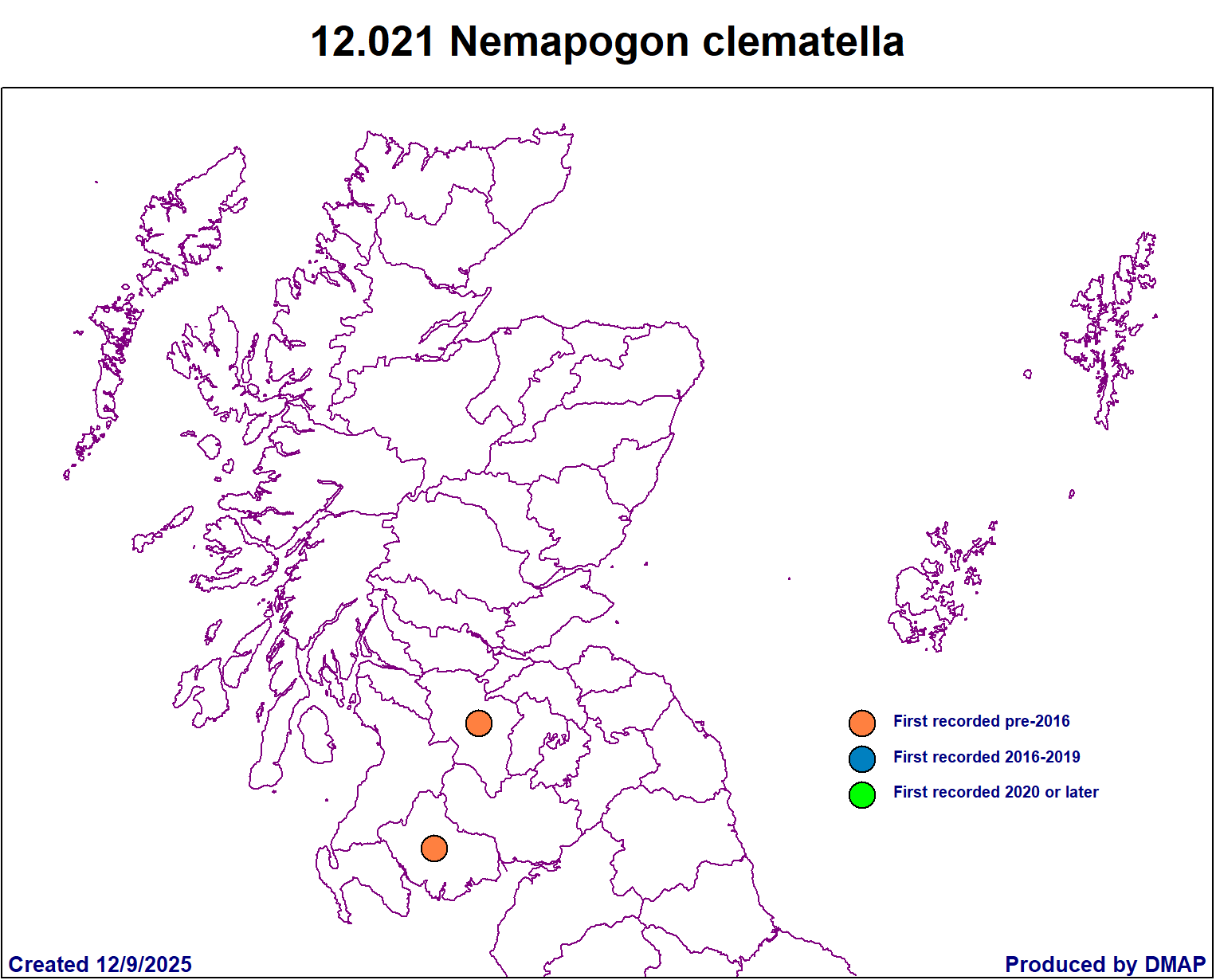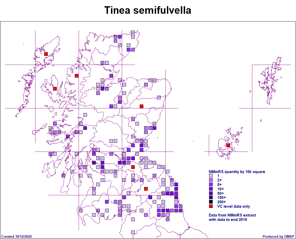 Scottish Micro Moth Distribution Maps Compiled by Mark Cubitt The table on this page lists the micro moths of the family shown that have been recorded in Scotland. The maps show, at a vice county level, where each species has been recorded. Clicking on the map will show an enlarged version of the map. The cursor (arrow) keys on a keyboard can be used to move to the next or previous species' enlarged map. Clicking on the Taxon (scientific name) will open a browser window for that species in the ukmoths web site. Data has been supplied by Dr Mark Young in collaboration with Tony Davis. The list is provisional and may contain some errors and Mark would welcome any comments about this from anyone finding such errors. New vice county records are published in the Annual Microlepidoptera Review, which appears each year in the Entomologists Record journal. Updates are made periodically based on new records which should be submitted annually via your county moth recorder to both Mark and Tony. . Species with a first record in 2016 and later are shown with a blue spot, in 2020 with green and earlier records an orange spot. Page last created: 12/09/2025