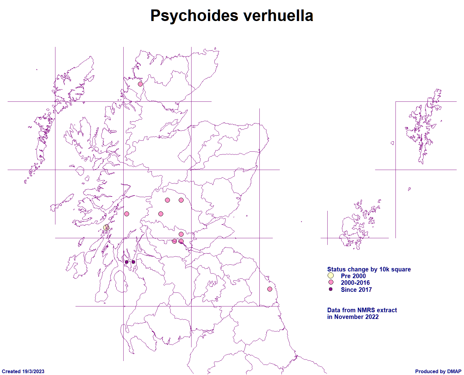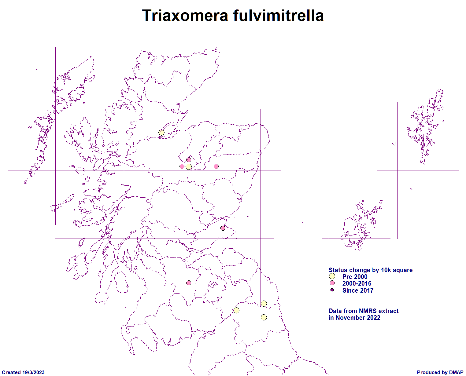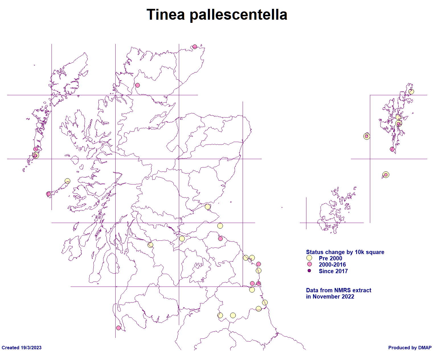 Scottish Micro Moth Distribution Maps Compiled by Mark Cubitt The table on this page lists the micro moths of the family shown that have been recorded in Scotland. The maps show, at a vice county level, where each species has been recorded. Clicking on the map will show an enlarged version of the map. The cursor (arrow) keys on a keyboard can be used to move to the next or previous species' enlarged map. Clicking on the Taxon (scientific name) will open a browser window for that species in the ukmoths web site. Data has been supplied by Dr Mark Young in collaboration with Tony Davis. The list is provisional and may contain some errors and Mark would welcome any comments about this from anyone finding such errors. New vice county records are published in the Annual Microlepidoptera Review, which appears each year in the Entomologists Record journal. Updates are made periodically based on new records which should be submitted annually via your county moth recorder to both Mark and Tony. . Species with a first record in 2016 and later are shown with a blue spot, in 2020 with green and earlier records an orange spot. Page last created: 12/09/2025