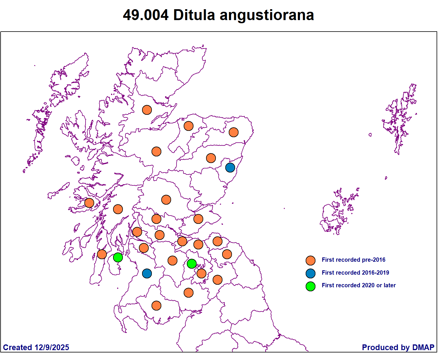 Data has been supplied by Dr Mark Young in collaboration with Tony Davis.  The list is provisional and may contain some errors and Mark would welcome any comments about this from anyone finding such errors.  New vice county records are published in the Annual Microlepidoptera Review, which appears each year in the Entomologists Record journal.  Updates are made periodically based on new records which should be submitted annually via your county moth recorder to both Mark and Tony. .